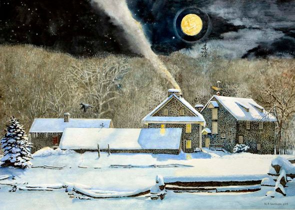 "As the Crow Flies" (Andrew Wyeth's Mill) was drawn in 2013. It was drawn to memorialize the passing of Andrew Wyeth, (1917- 2009). This image is of Andrew Wyeth's home in Chadds Ford, Pennsylvania. They say he died in his sleep, so I tried to depict the night that he died. I believe it to be one of my best landscape pencil drawings to date. Through the years, as I have looked at it, the need to take it further and create a watercolor painting of the image slowly erupted inside of me. I started this painting on January 16th, the anniversary of Wyeth's death and completed it in 6 weeks. - N.S.