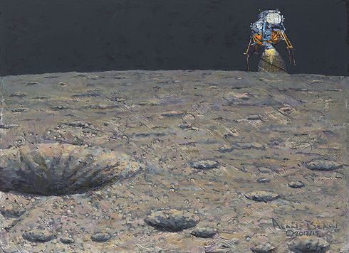 From the Artist: Neil and Buzz were well below 2000 feet in their descent before Neil could study the landing area. “Pretty rocky area,” Neil said. He knew that overflying the programmed landing area was going to add risk to an already risky enterprise. Were the landing conditions up ahead any better than right here?