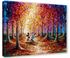 Step into the enchanting world of 'Colorful Forest' by Jennifer Lanna, where Mickey and Minnie Mouse stroll through a vibrant autumn landscape. This captivating artwork features pink, red, and gold-leaved trees, bathed in the soft glow of sunlight.