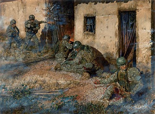 About the Art: A historical painting stands or falls on how well it depicts the story it is attempting to illustrate, and how convincingly it combines the people, their actions, costumes, surroundings and atmosphere in an appropriate composition. A good historical painting uses all of these elements to tell the major story and perhaps a second subtext. Both are driven by how interesting the situation is that the artist is attempting to render. How the viewer reacts to a great painting transcends its immediate story and strikes a deeper chord, one that hopefully evolves and changes as the viewer contemplates the art over time. It is this last and most worthy goal that artists like James Dietz aspire to. In his portrait of events in the 20th and 21st Centuries, he labors to achieve that rare combination of historical fact and the romance, adventure and color of fiction. Born in San Francisco, Jim graduated from Art Center College of Design in 1969. He had a successful illustration career in Los Angeles and New York, with a steady flow of work ranging from automobile ads, movie posters, and romantic and historical/action book covers. By 1978, Jim and his wife had moved to Seattle, where Jim's work gradually shifted away from commercial illustration to primarily historical aviation, automotive and military art. Today his work is internationally known and collected, and his style, with its emphasis on depth of story, is recognized by collectors of historical art. His list of clients includes Boeing, Bell Helicopter, Federal Express, Allison, Cessna, Flying Tigers, the Indianapolis 500, BMW, US Air Force Documentary Art Program, Wingnut Studios, Meadowbrook and Pebble Beach Concours d'Elegance, the National Guard and many U.S. Army organizations and associations to include: the 82nd Airborne Division, the 101st Airborne Division, U.S. Army Rangers, Special Forces, 1st Division, 2nd Division 3rd Division, 4th Division, 1st Cavalry Division, 11th Armored Cavalry Regiment, 173rd Airborne Regiment, the Command General Staff College, and the United States Army War College. Jim and his wife, Patti, live in Seattle with their dog, Sarah, who shares the distinction with previous Dietz pets, of being a regular in Jim's paintings. Their son, Ian, is currently an officer serving in the U.S. Army. Jim works in a warm, pleasantly cluttered studio that resembles a WWI aviation bar, surrounded by uniforms, props and models that have made their way into paintings over the years.