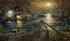 About the Art: Across the river at the Lakeside Conservation Club, the party is in full swing. Some drove to this idyllic setting, others arrived by boat after a little hunting and fishing along the way. Their dogs wait patiently by the water, as a flight of buffleheads swoop low in the setting sun's golden rays. All is serene in this romantic painting, but the artist asks us to consider the impressive rail fence in the foreground. Sturdy enough to hold cattle in the pasture, it is carefully positioned on the river's bank, so that enough of the stream's flow creeps under the fence to offer the herd a good hearty drink.