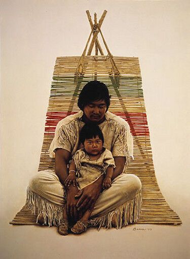 About the Art:"My models were a half Zuni, half Navajo Indian named Louie Charlie and his son, Christopher who was two years old and just adorable. Because he looked so much like his father, I thought I would do a father and son painting rather than the usual mother and child. "The seat is a traditional period one and used by men and not women. They were re-creating Indian life in the pre-Columbian days, before the arrival of the white man."