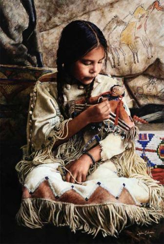 About the Art: On a recent trip to the site of the Battle of Little Big Horn and Crow Agency, I was fortunate to come across a Crow family who were all great models. I particularly enjoyed watching this little girl lovingly play with her favorite doll as if she weOn a recent trip to the site of the Battle of Little Big Horn and Crow Agency, I was fortunate to come across a Crow family who were all great models. I particularly enjoyed watching this little girl lovingly play with her favorite doll as if she were her mother. My painting, “Mother’s Favorite” portrays a little Crow girl from the 1870’s and was inspired by this encounter.re her mother. My painting, “Mother’s Favorite” portrays a little Crow girl from the 1870’s and was inspired by this encounter. - JC
