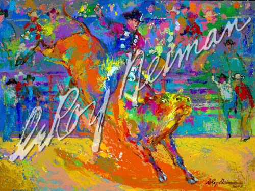 Over the years LeRoy Neiman has attended many events featuring the bull in Mexico, Spain and the U.S from bull dogging to bull fighting. With his first bull riding experience he was captivated by the vibrant sights both in and out of the bull riding ring. He observed the enormous bulls all corralled together and was transfixed by the bull and the rider each sizing one another up, each determined to be the best and to be the conqueror.