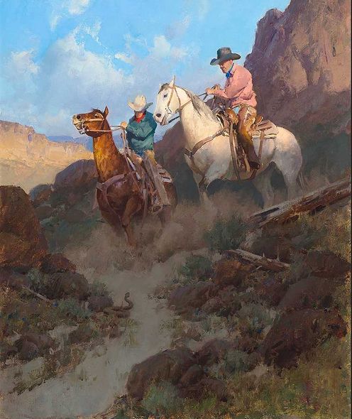 About the Art: By the time you hear him, you’re too close!’………….that is especially true on horseback. Bringing a horse to a sliding downhill stop on loose footing is unnerving, especially when you can hear but not see the snake. The Mojave Green rattlesnake packs extremely potent venom and he is common all over the brush covered canyons of Arizona ranch land.