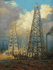 About The Art: Missouri artist Andy Thomas enjoys painting a wide variety of subject matter. History and nostalgia are two of his favorites that combine in this oil field scene from a century ago. Boom towns sprang up over night attracting hundreds in search of Black Gold. This particular painting is a study in light and shadow as the foreground in shadow contrasts beautifully with the wooden derricks in the sunlight.