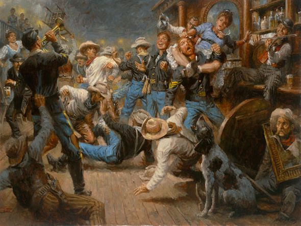 About the Art: Andy Thomas paints action-packed Western scenes that come to life on his canvases. Loving to tell stories with his paint brush, the artist has created one of his trademark, lively scenes. The Wild West had many kinds of characters, from lawmen, to gentlemen, to outlaws, who sometimes clashed when someone would start a "c." Andy Thomas is not only an immensely talented painter, but also a storyteller with the images he creates. His subject matter consists of a variety of images from historical events to intimate moments of everyday life. The artist's desire to create is funneled into the area of painting realism that ranges from very loose to very tight. Thomas's medium is primarily oil, but he also works in watercolor, pen and ink, charcoal, pencil, and ink wash. He is also a very accomplished sculptor.