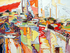 Soon after graduating from university, Rozenbaum immigrated to Israel where she makes the cities of her new homeland the subject of her paintings, her vivid imagination turning scenes of reality into the fantastical. Her images encompass buildings, streets and traffic, as well as people, and sometimes a hint of the desert beyond and the ocean. But it is not the reality of city-life that she paints, rather it is the palpable energy that emanates from the city, its living, breathing presence with all the separate parts that inter-relate to create this urban organism.