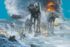 About the Art: A dramatic depiction of the desperate final moments of the Battle of Hoth as Imperial forces overwhelm the Rebel defenses. The painting captures the iconic battle from Star Wars: The Empire Strikes Back™, showing Imperial AT-AT walkers dominating the snowy landscape. Their imposing mechanical forms tower over the battlefield amid explosions and combat debris. In the foreground, Imperial snowtroopers advance across the icy terrain. Rebel snowspeeders engage the walkers, with one using tow cables to bring down an AT-AT while another fires directly at a walker. The color palette features cold blues and whites of Hoth's frozen landscape, dramatically contrasted with the warm oranges and reds of explosions and blaster fire.