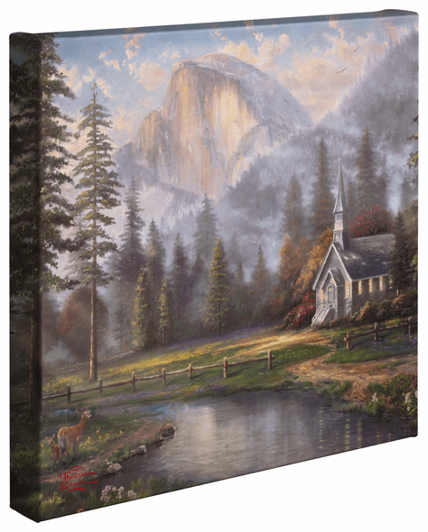 In Thomas Kinkades writings he often referred to the natural world as God’s greatest cathedral. Thom honestly felt that you could see the Creator’s face in a mountain vista, hear His voice in the babbling of a brook, and feel His presence in a gentle mountain breeze. He felt God, as experienced in nature, would envelop the human senses and reach down through the body and into the eternal soul. Thom was raised in the mountains and held this belief from an early age; and returned there often to commune with his God and receive His grace. He would also routinely take the inspiration received there back into the studio, and with oil on canvas reach out to all those who loved his work. Indeed, Thom’s landscapes are spiritual statements in the form of art and work as his personal testimony to the reality of God. The Valley Chapel is no exception. This small historic church was built in the face of all of God’s grandeur in Yosemite Valley and has been a spiritual resource there since the late 1800’s. In the distance, Half Dome rises above the chapel giving perspective on man and our accomplishments in the scope of God’s universe. God is limitless in time promising an eternity without beginning or end, and He is boundless in size granting us view into all that is and all that ever will be. The size of the granite monolith, and the time it took to carve from the earth, exists in stark contrast to the idea of the history of man or in terms of man’s simple creation. We are humbled in the face of God and yet exalted in His acceptance of our love. Thomas Kinkade Studios invites you to walk in the beauty of the Yosemite Valley. Experience a boundless God in Yosemite, His most sublime creation and the intimacy of His love in this small chapel nestled in that valley. © The Thomas Kinkade Estate - All Rights Reserved