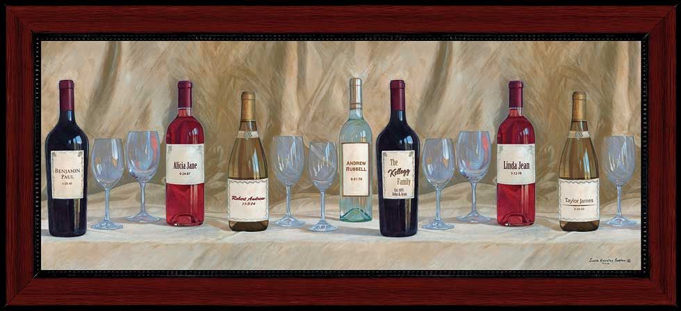 About the Art:7-BOTTLE Personalized Canvas by Susan Knowles Jordan. A toast to your family! Variable canvas size fits your family. Image size, 10" x 26". Framed size, 12-3/4" x 28-3/4". Made in the USA. Please specify: Mom and Dad's Names (optional), Mom and Dad's Anniversary (optional) and Name and Birthday of each family member in the comment box at checkout