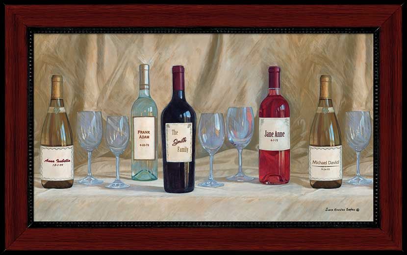 About the Art:5-BOTTLE Personalized Canvas by Susan Knowles Jordan. A toast to your family! Variable canvas size fits your family. Image size, 10" x 18". Framed size, 12-3/4" x 20-3/4". Made in the USA. Please specify: Mom and Dad's Names (optional), Mom and Dad's Anniversary (optional) and Name and Birthday of each family member in the comment box at checkout.