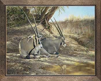 About the Art: Framed Heat of the Day-Gemsbok Canvas by Ron Van Gilder. Premier giclée canvas edition of 15 signed and numbered canvases. Image size, 28" x 36". Framed size, 33" x 41" with 2-1/2" black moulding with gold finish. Certificate of Authenticity. A Wild Wings exclusive.