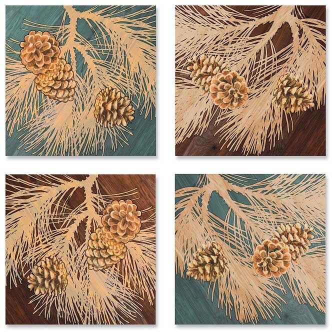 About the Art: Simple clusters of pinecones and boughs transform into delightful artistry on your wall. Four separately wrapped canvases allow you to adjust your decor anytime you like. Open editions. 10-1/2" x 10-1/2" wrapped canvases.